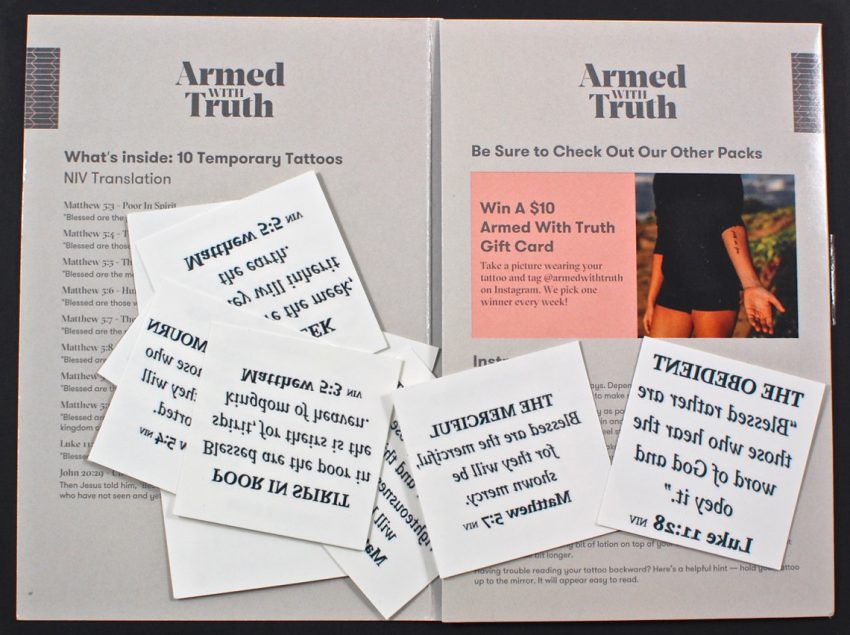 To help you remember the Beatitudes, the box included a set of temporary scripture tattoos that can be worn on your wrist or anywhere else they can be easily viewed. There are 10 tattoos in all, each of which last 3 to 5 days. — Enough time to memorize the scripture before you apply the next one.