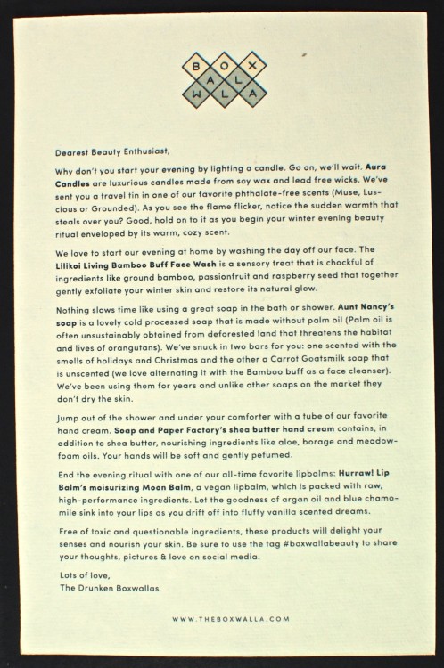 The theme for December’s box was “Winter Evenings”. The info card listed all of the items inside, along with how to use them and why they were chosen.