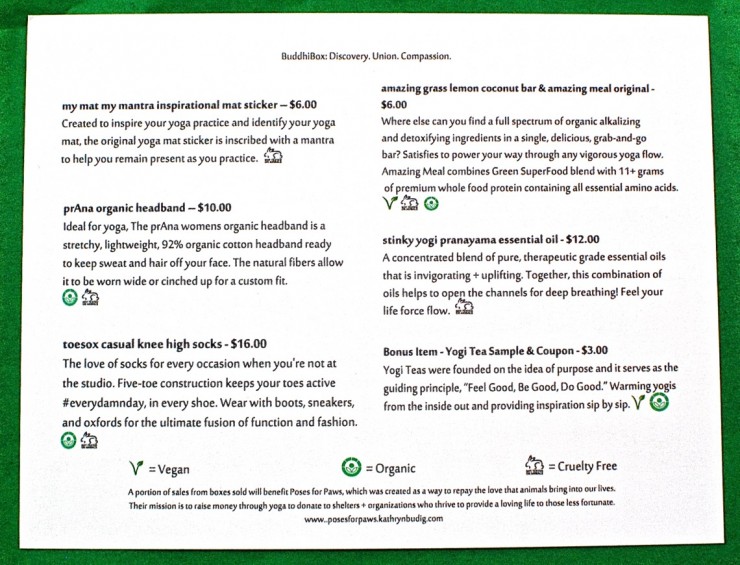 The info card includes descriptions of each product as well as their retail prices. It also indicates if an item is vegan, organic, or cruelty free. Every month a portion of their sales are given to a different charity. This month it’s Poses for Paws, an organization that raises money through yoga to donate to animal shelters.
