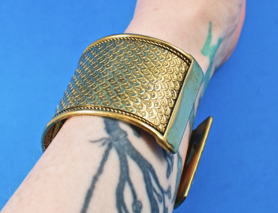 This large gold cuff bracelet was handcrafted in India by artisans who are given a fair wage for their work. It features an art deco scallop design and is made of sustainable, non-toxic metal (brass?). I would have loved the silver version available in their shop, but what can ya do. 😉