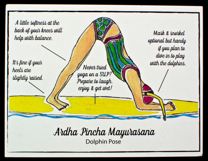 This month’s featured yoga pose was “Ardha Pincha Mayurasana” aka Dolphin Pose. Full “instructions” were included on the reverse side of the card.