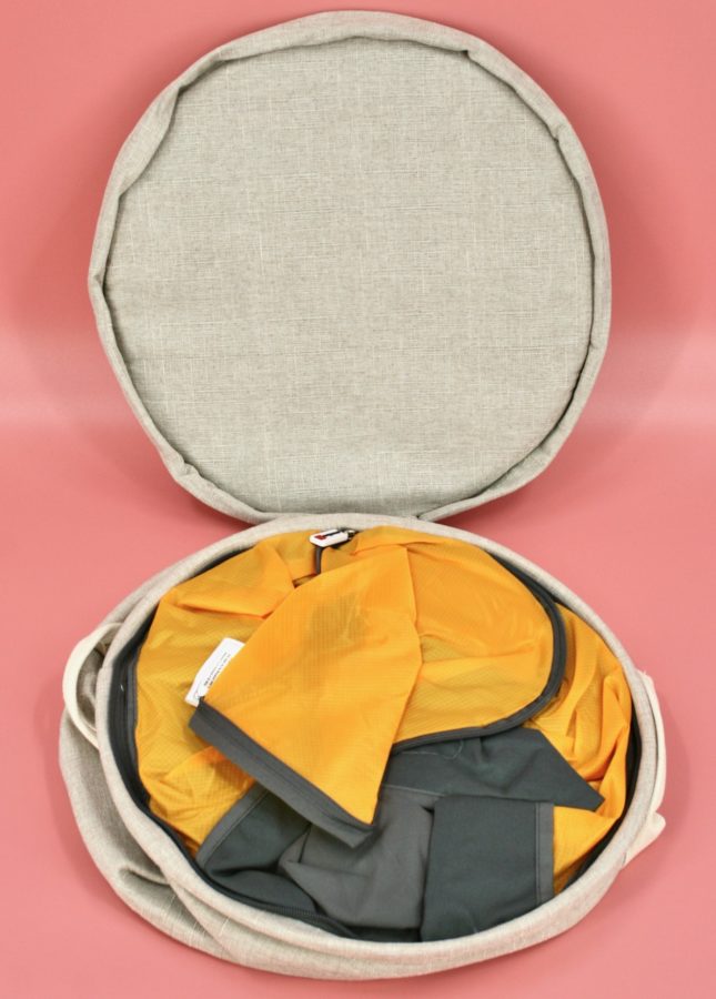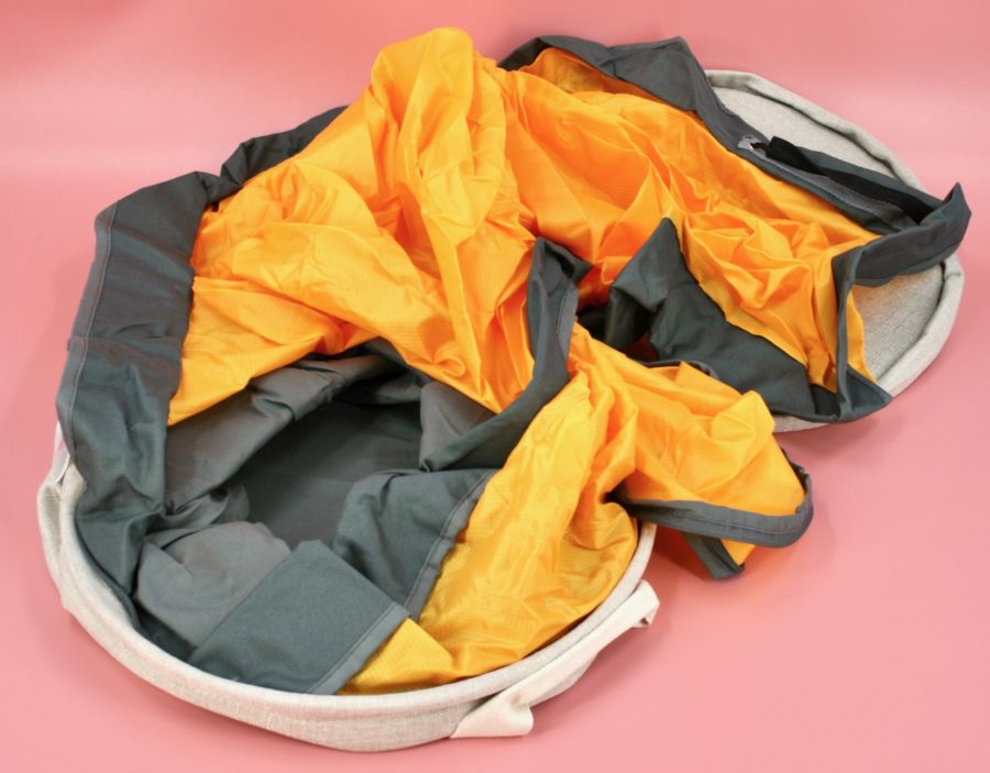 The (collapsed) basket opens up to reveal a built-in rip-stop play mat that the contents of the basket can be poured onto. It features a unique 3-inch padded rim to help keep tiny toys tidy and contained.