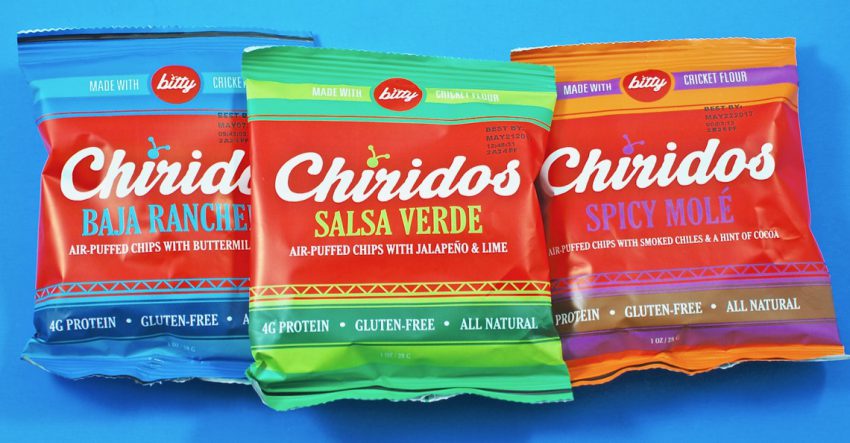 These air-puffed snacks are made with a blend of lentil flour, cricket — yes, cricket — flour, and other natural ingredients. They’re gluten-free, low in fat, and have 4 grams of protein per serving. 3 different flavors were included: Baja Ranchero, Salsa Verde, and Spicy Molé.