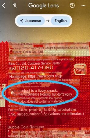 I think you could compare these candies to Pop Rocks, but in large tablet form. They work the same, by “activating” in your mouth and making fizzy bubbles while releasing a sweet cola flavor. I used Google Lens to help me translate some of the items and was amused by the line “You may experience bloating, but don’t worry.”. Ha! Thanks for reassuring me, label. 😉