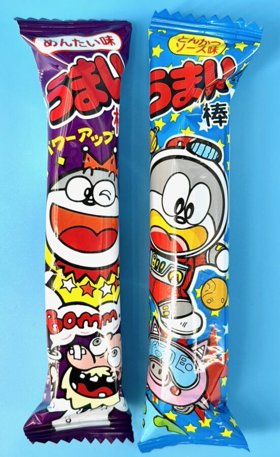 Umaibo is a popular cylindrical snack made with corn and various spices/flavorings. Sort of like the Japanese version of Cheeto, but larger and less bumpy. The flavor on the left (Mentaiko/Spicy Cod Roe) is described as savory with a little bit of spice. Tonkatsu (Pork Cutlet) on the left has a more sweet & tangy vibe.