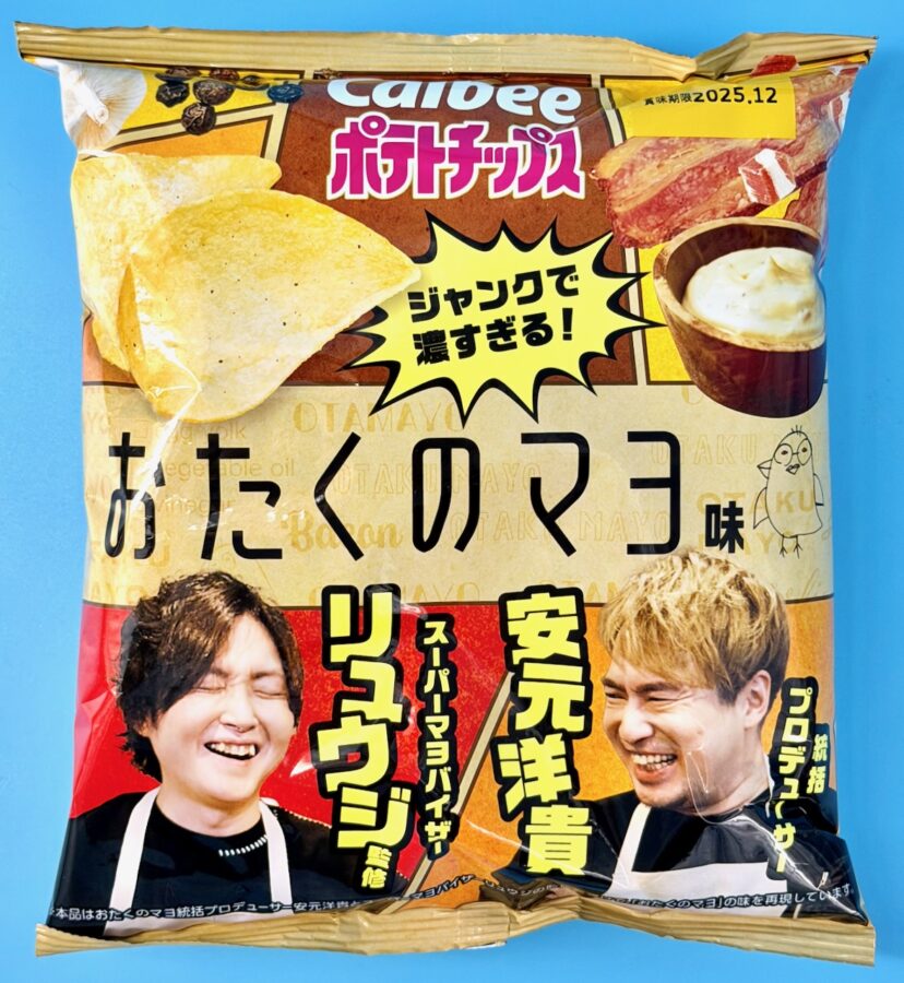 The package above contains a generous serving (multiple servings?) of Otaku mayonnaise flavored potato chips. I believe the two guys pictured (Ryuji and Hiroki Yasumoto) partnered to create its unique, savory flavor. That, or they just really enjoy it. 😉 Sadly, nobody in our house likes mayo, so we’ll be saving this for guests.