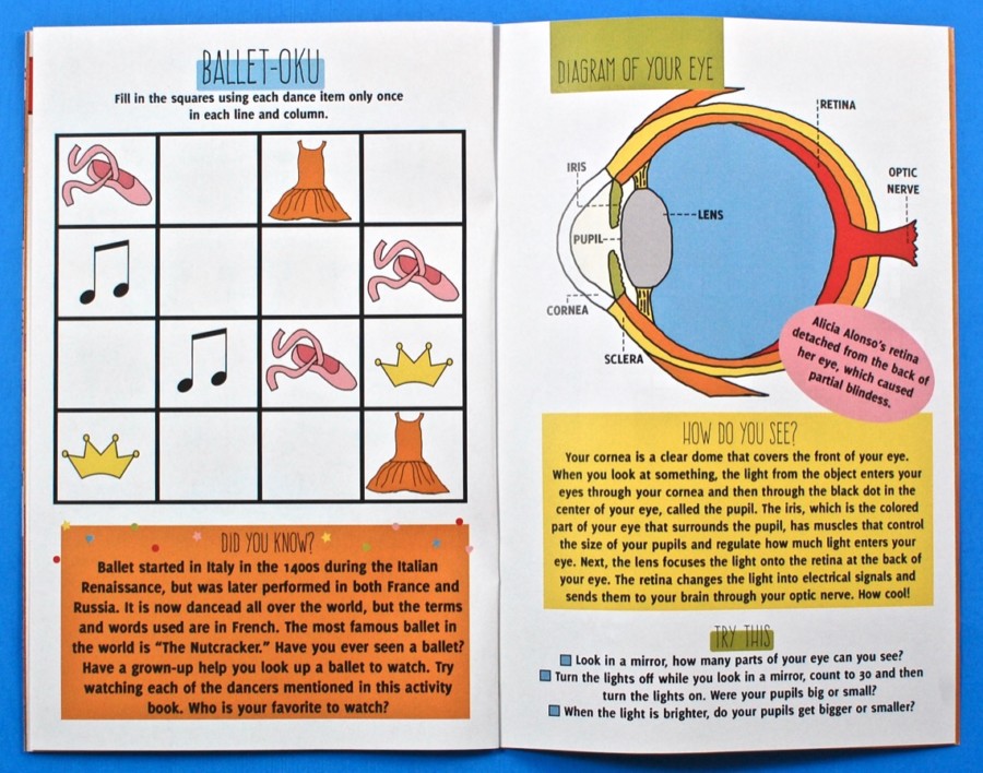 A 20-page, full color activity book included the story of Alicia Alonso and how she had to overcome many obstacles — including multiple eye surgeries — on her path to becoming a famous (partially blind!) dancer. It also included puzzles, games, experiments, and more. All of the activity instructions were printed in the booklet as well.