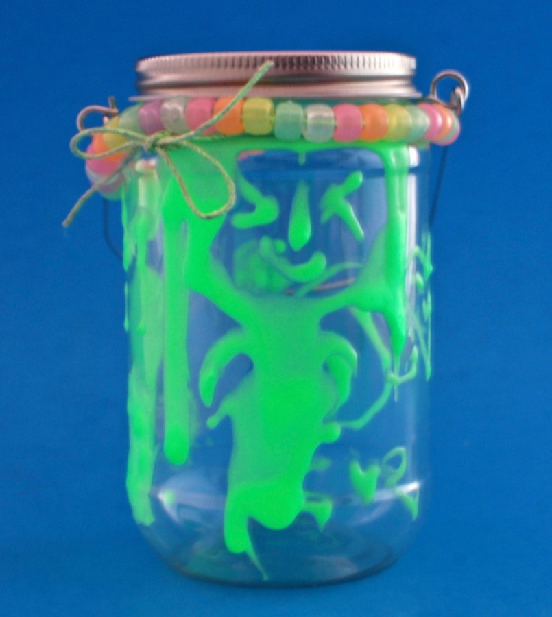 The second activity was to make a cute “radioactive” (glow-in-the-dark) night light. Materials included a plastic jar, glow paint, a stencil sheet, glow hemp, a metal hanger/handle, and glow beads.