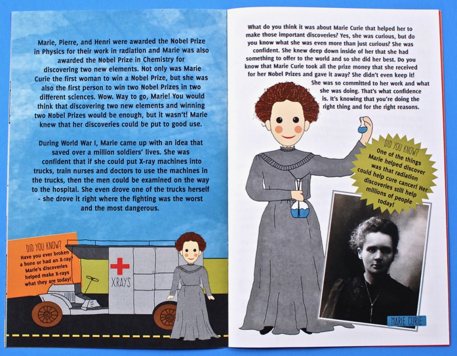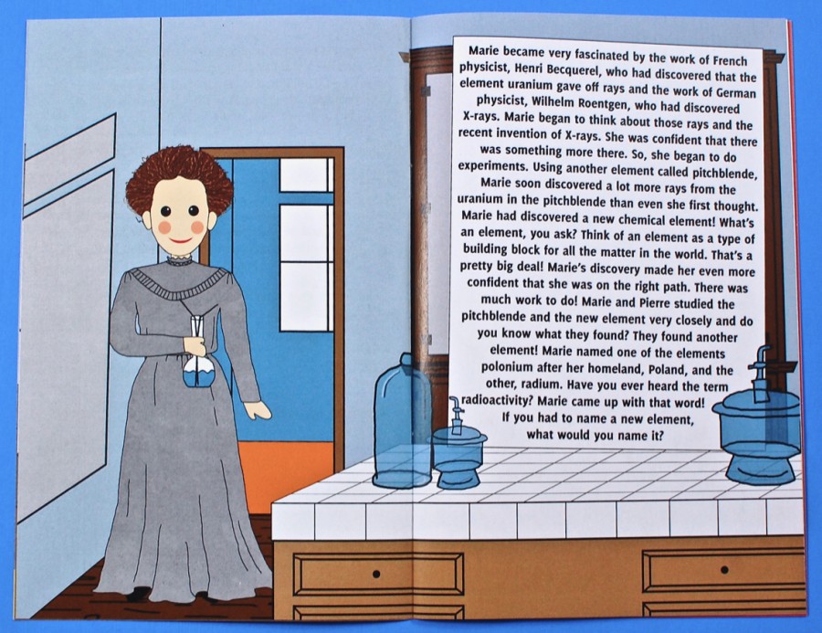 A 20-page, full color activity book included the story of Marie Curie and she championed the use of radiation in medicine and fundamentally changed our understanding of radioactivity. It also included puzzles, games, experiments, and more. All of the activity instructions were printed in the booklet as well.