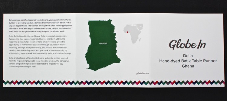 The theme for December’s box was “Celebrate” and included a hand-dyed table runner made in Ghana. The info card explained more about the company behind it (Della) and how they not only pay their employees a fair wage, but also give them opportunities to further their education.