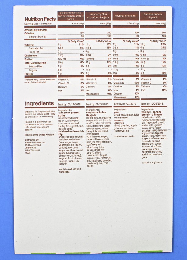 An info card listed all of the snacks in my box, as well as nutritional info and ingredients for each one. (The text is pretty tiny, but much easier to actually read in person.)