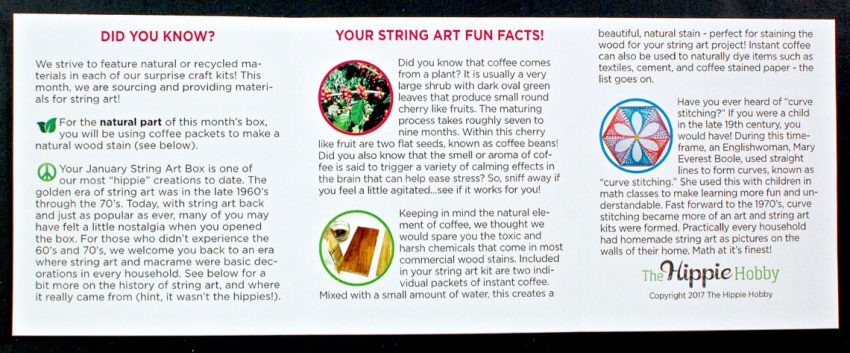 There was also a small insert that gave a little history and some fun facts about string art, whose golden age was in the late 1960’s through the 70’s.