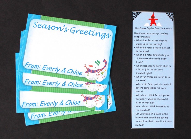 Every Ivy Kids box comes with a personalized item with your child’s name on it. This time it’s a set of 8 notecards(?) featuring “Seasons Greetings”. While they’re cute, I’m not sure why they were included in a January box. Not a big deal though, since we can just save them for next year. They also include a bookmark in each box, which has a list of discussion questions relating to the book.