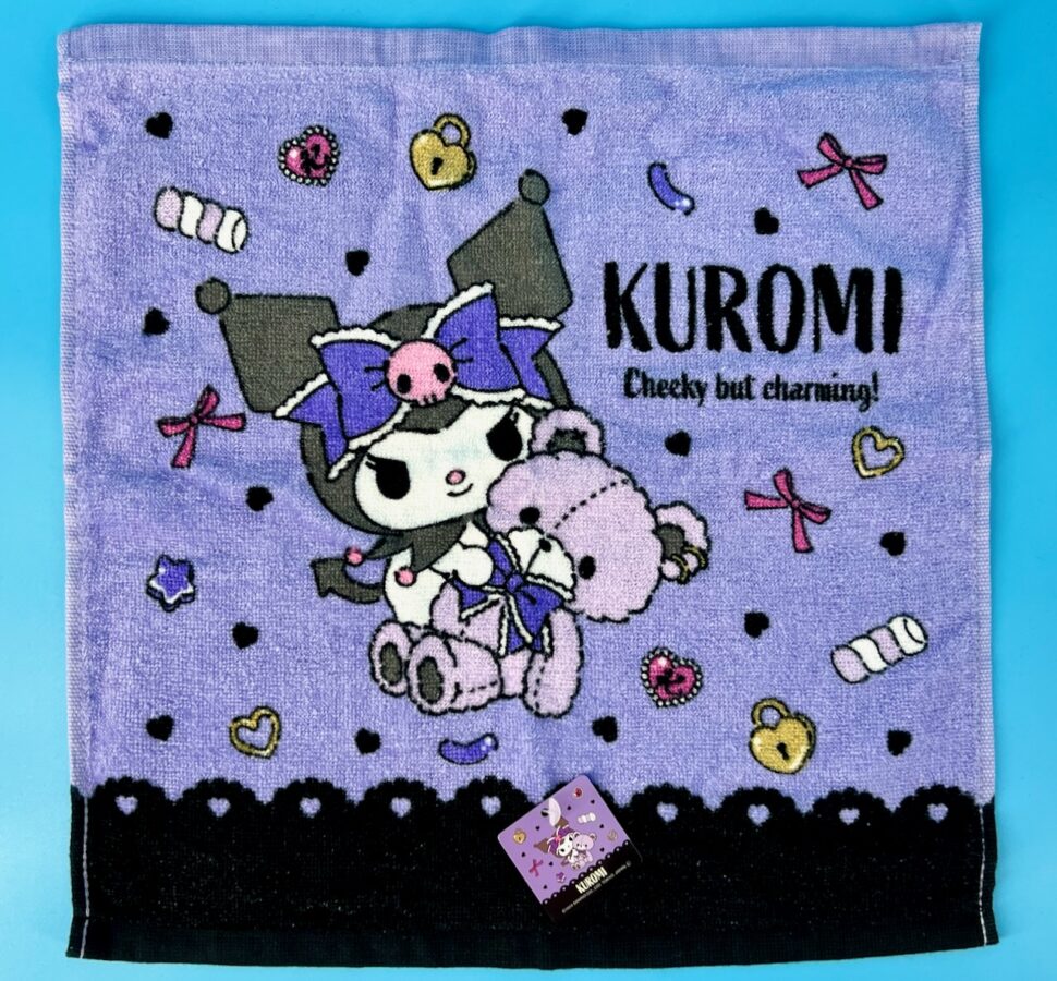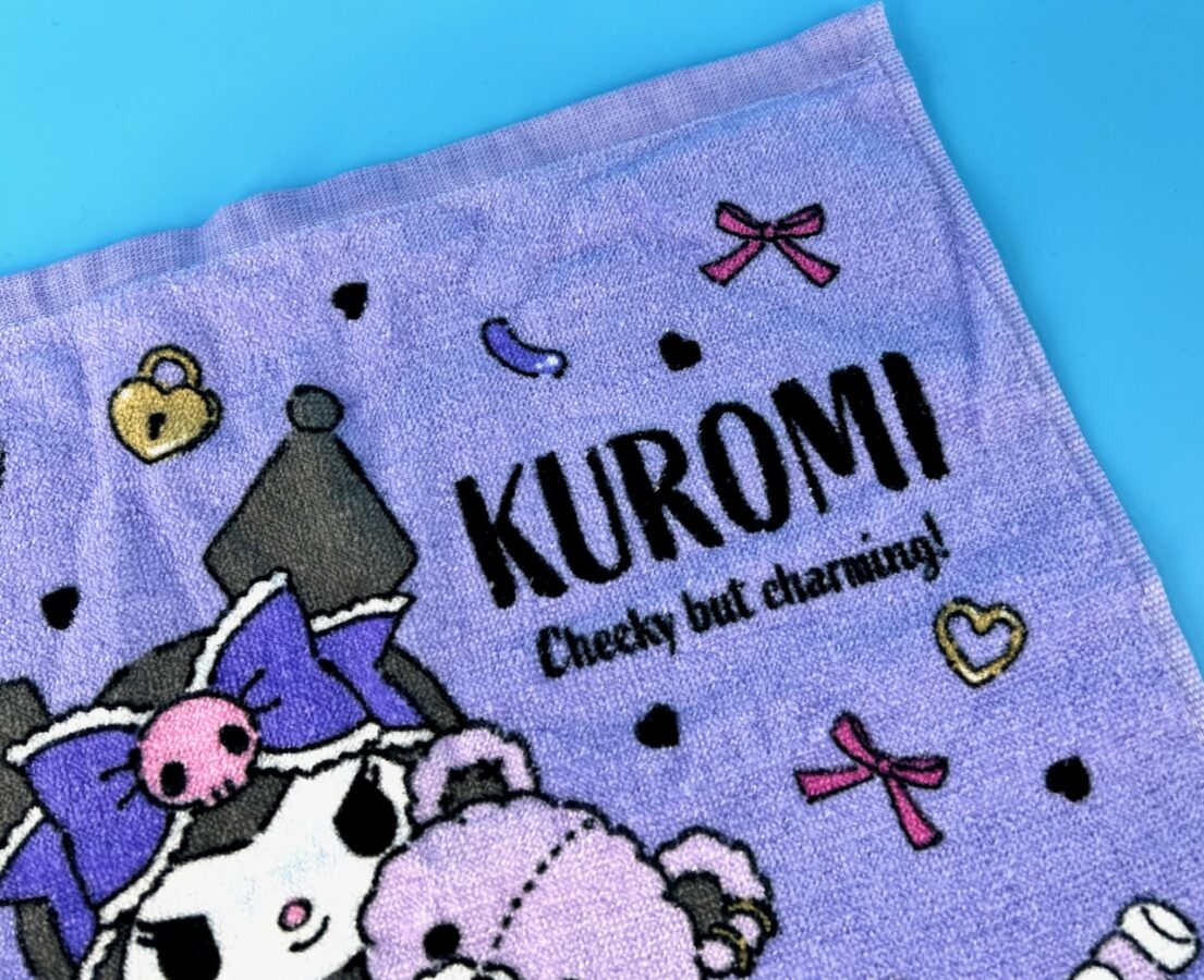 I hadn’t really been a big Kuromi fan before, but after playing Hello Kitty Island Adventure daily over the last few weeks she’s really grown on me. 😉 The Sanrio towel above features a grinning Kuromi clutching a teddy bear with the text “Kuromi — Cheeky but charming” in the top right corner. It measures roughly 13 inches by 13 inches, making it a good size for a washcloth or dish towel.