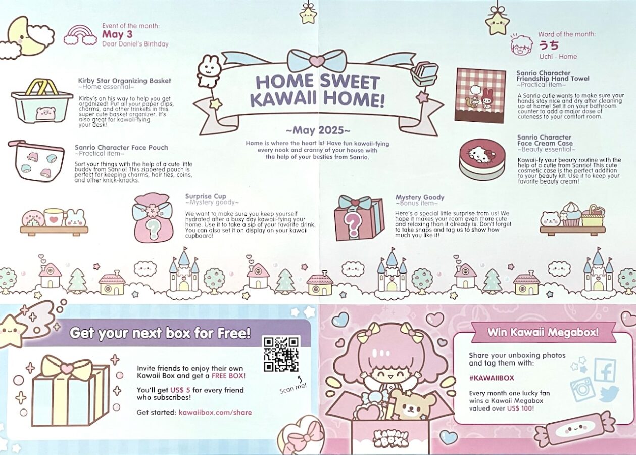 An info sheet listed all of the items in May’s box, along with drawings and brief descriptions for each one. — The theme for May was “Home Sweet Kawaii Home!”.