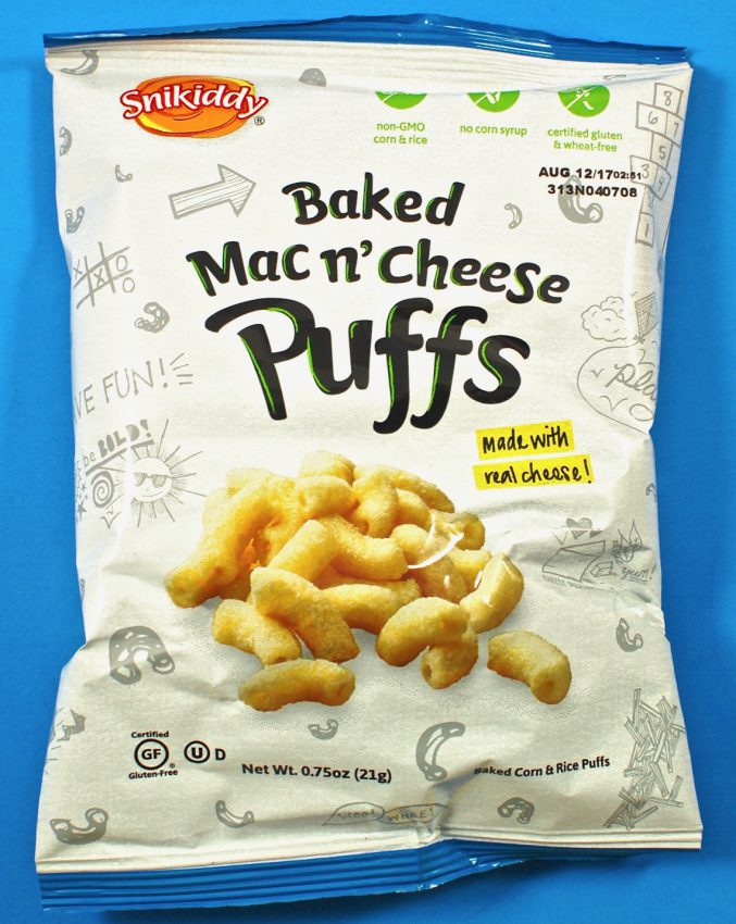 Snikiddy Baked Mac n’ Cheese Puffs – All natural baked potato & corn snacks made with real cheese. They’re certified gluten-free, non-GMO, and contain no artificial colors, preservatives, flavors or ingredients.