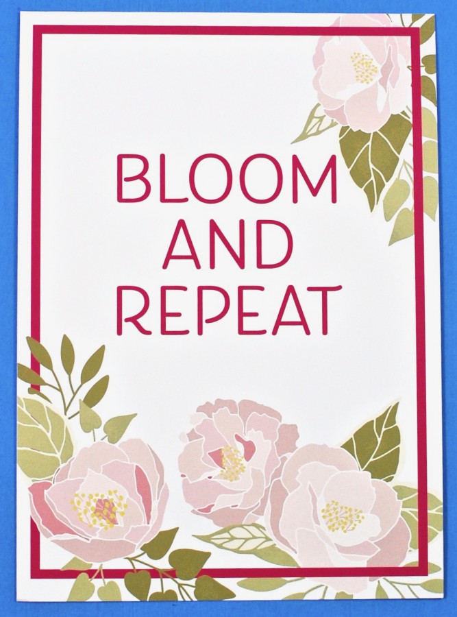 August’s 5 x 7 inch mini poster/print featured the phrase “Bloom and Repeat” printed in pink text surrounded by blooming flowers. The back included additional text which read “Bloom where you are planted”.
