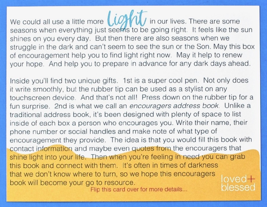 May’s Loved + Blessed box was a timely reminder that we can all use a little more light during these dark times. I love “fun” pens and the unique take on the address book was a neat idea. 🙂