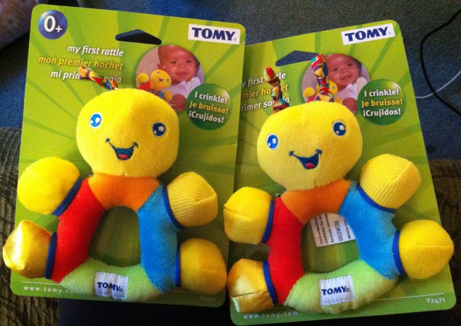 - Tomy (requested proof of birth) – Received: 2 soft rattles, 2 sets of 4 colorful sippy cups with travel caps.