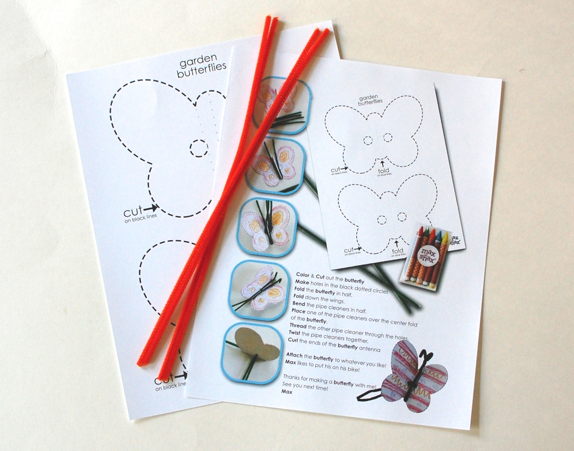 Garden Butterflies Activity – Cut out, decorate, and build your own paper butterflies. Use the included crayons and pipe cleaners to help your little one make their own garden butterfly masterpieces.