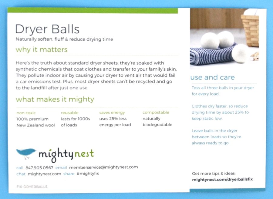 A 2-sided product card revealed my featured item for August — a set of Dryer Balls. The card stated that my new dryer balls are a great alternative to standard dryer sheets, which can emit up to 8 hazardous air pollutants. The sheets pollute your indoor air by causing your dryer to vent air that would fail a car emissions test. Not cool! (Or clean.)