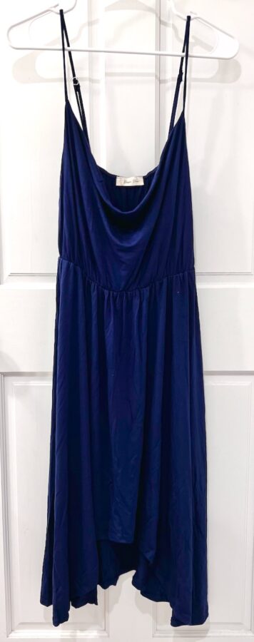 The second clothing item in my box was a mid-length/midi dress in navy blue. It featured adjustable spaghetti straps and a scooped/cowl-ish neckline. The form-fitting cinched empire waist offered a flattering silhouette while the flowy bottom half with its shark bite style hem added a bit of added flair.