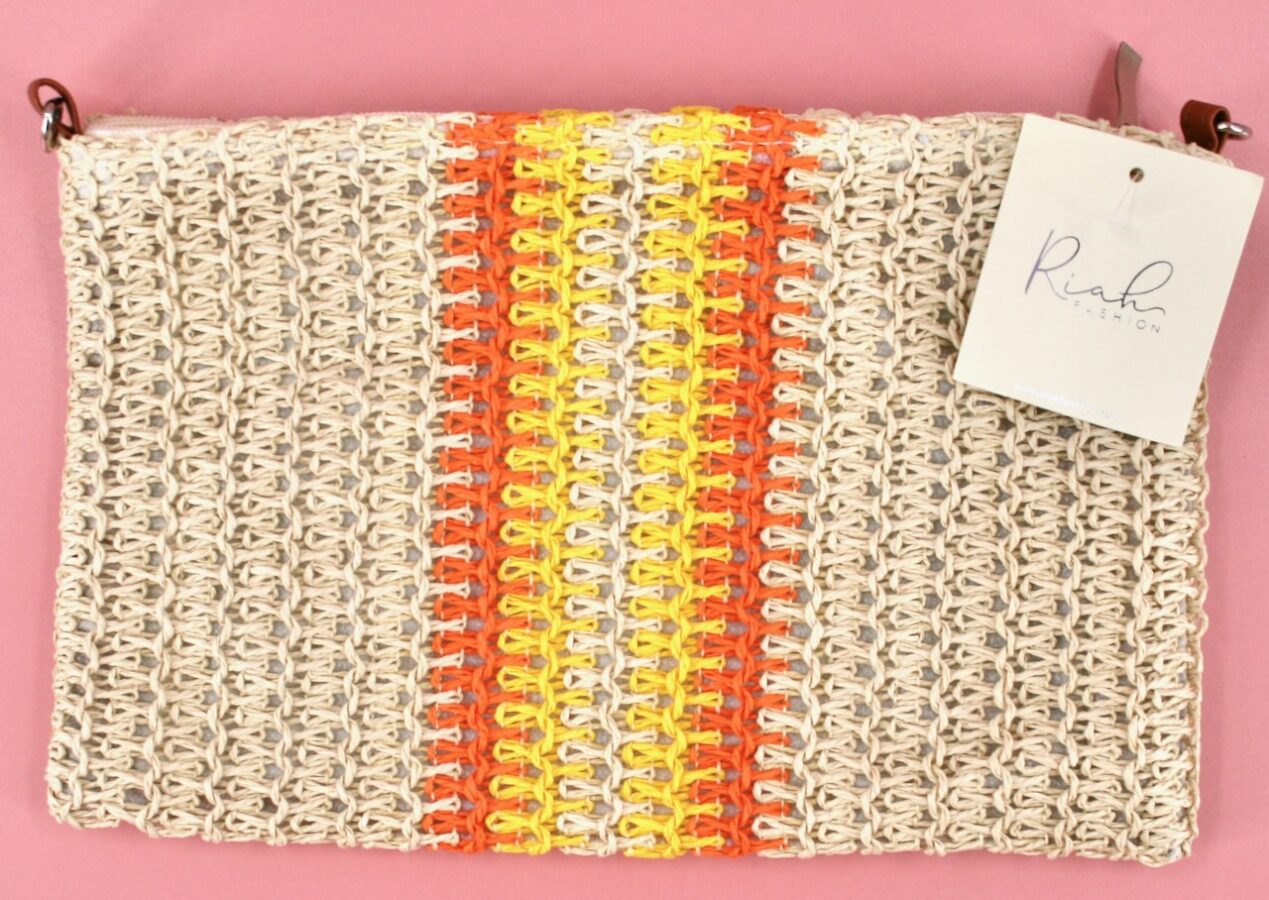 This cute lightweight crossbody bag is a great accessory to hold all of your summertime essentials. Its brown detachable (and adjustable!) strap allows you to wear it as a crossbody bag/purse or carry it by hand as fun little clutch. The outside features a white/orange/yellow striped woven design, while the inside is lined with a cream colored nylon-like material. It measures roughly 11 inches long by 8 inches tall.