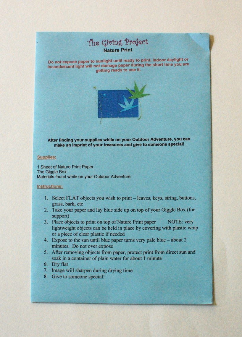 The Giving Project: Nature Print. Make sure to have your little ones bring home a souvenir or two from their hike. Preferably something flat such as leaves, grass, flowers, etc. This activity involves making a nature print with the light-sensitive paper included in the envelope shown above. The finished print is intended to be given to someone your child loves, hence “The Giving Project”. Love this!