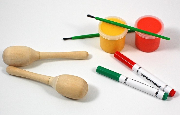 Maracas – The first project involved painting and decorating a pair of wooden maracas. Included were 2 maracas, 2 pots of tempera paint, 2 paint brushes, and 2 markers. I was a little nervous about letting my girls use actual paint since they’re still under 3, but they actually did a pretty good job.