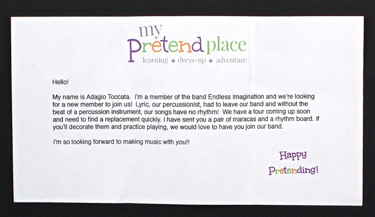 The box included a letter from “Adagio Toccata”, a member of a band in need of a new percussionist. He explains that he sent along a couple instruments for your child to decorate and practice playing.