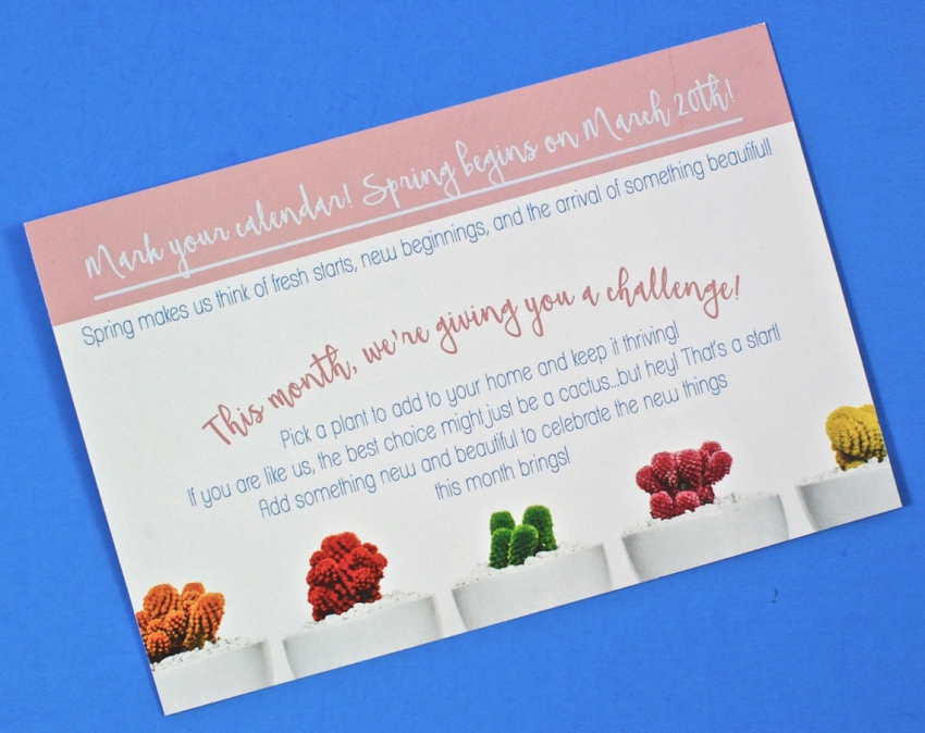 An insert card celebrated the arrival of Spring and challenged you to add a new plant to your home to mark the occasion.