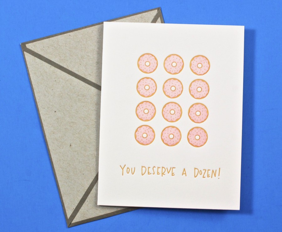 Let someone know how much you appreciate their hard work with this donut-themed letterpress card from Ink Meets Paper. It features a dozen pink frosted donuts with the phrase “You deserve a dozen!” printed below. Cute!
