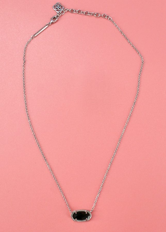 The Kendra Scott “Elisa” necklace features a thin silver chain that holds their signature oval-shaped pendant with a black-colored stone. The linked chain is approximately 15 inches long with a 3 inch extender and is made of rhodium over brass. When worn at 15 inches, the pendant hits right above my collar bone/top of the sternum (yes, I Googled that. 😉 ).