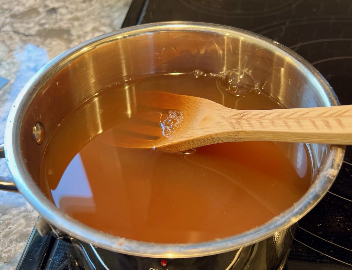 Once cooled, I scooped all of the soap nuts out and was left with this brown-colored “broth”. 😉
