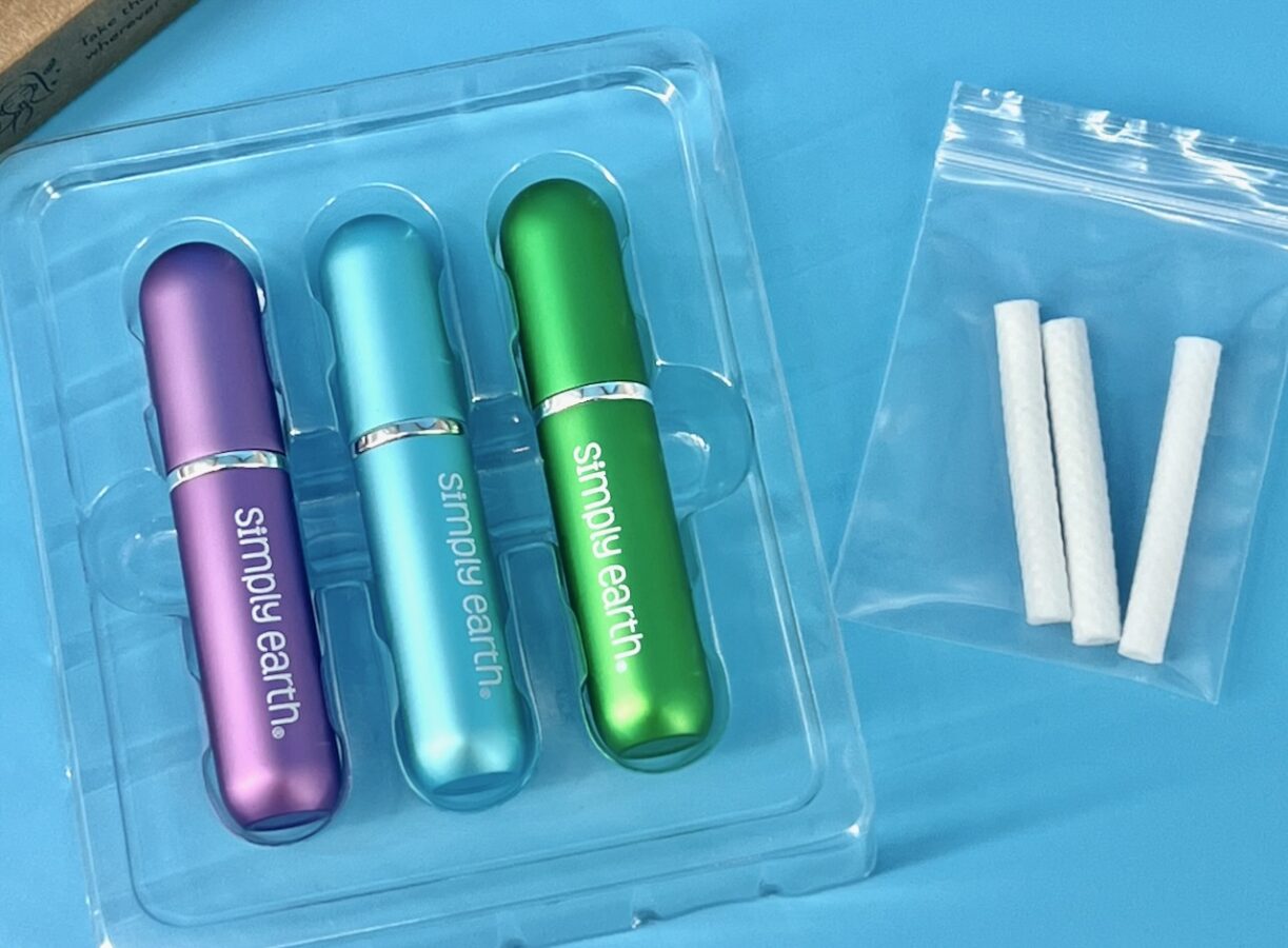 A set of three colored aluminum aromatherapy inhalers were provided for easy aromatherapy on the go. Inside each tube is a cotton pad onto which the oils are placed.