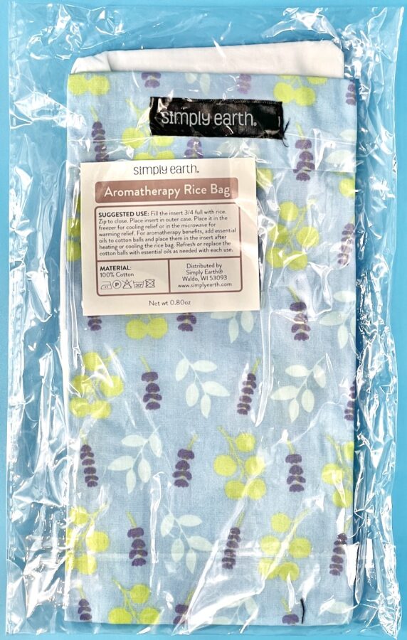 A small fillable pillow (white) and pillowcase (patterned) were provided to make a soothing hot/cold rice bag. Both are made of 100% cotton and should be hand washed when needed.