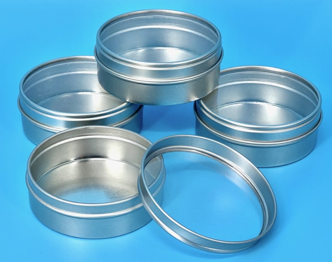 Four round metal tins with clear/windowed lids were provided to hold the salves/ointments included in the kit.