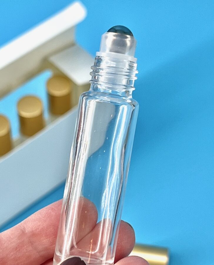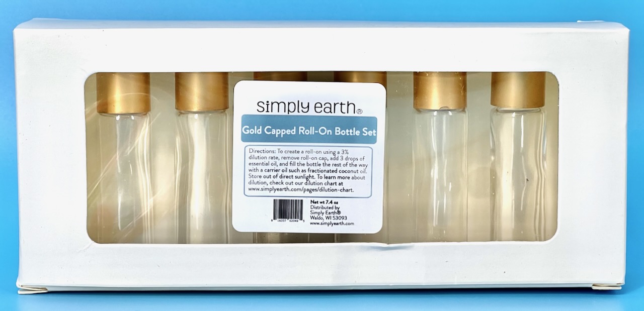 One of the easiest ways to enjoy the aromatherapy benefits of essential oils is to create a simple roll-on “perfume”. The box above contains six clear roller bottles with pretty gold caps to hold any scent combinations that you choose to create.
