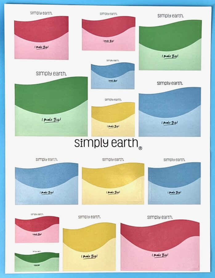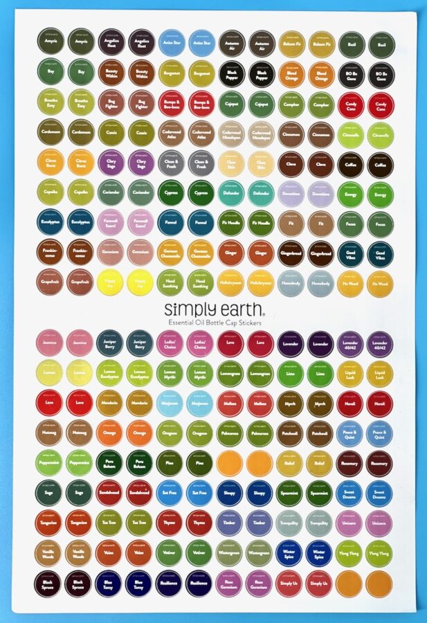 The sticker sheet above contains 216 stickers — two for each oil and blend (& a few extra). They were designed to fit on the tops of Simply Earth 5mL and 15mL bottles.