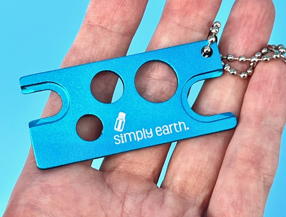 This handy little tool was designed to make it easier to open/remove the caps of your essential oil (and storage) bottles. To use, just wedge the U-shaped space under the bottle cap and gently leverage the cap upwards. To reseal, position the correct size hole over the bottle cap and gently apply downward pressure. (I’ve used it and can confirm that it makes removal SO much easier!)
