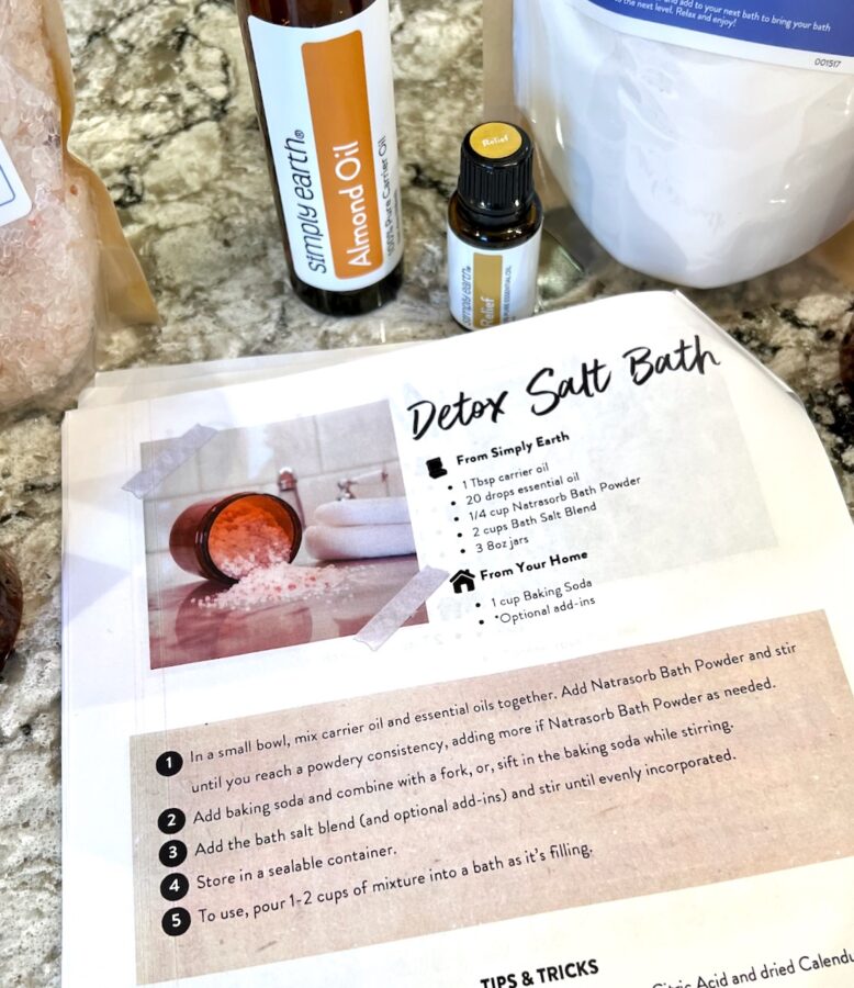 Materials required: Carrier oil (I used the almond oil), essential oil of your choice, Natrasorb bath powder, bath salt blend, 8 oz jars, and baking soda from home.