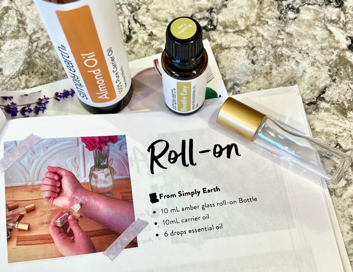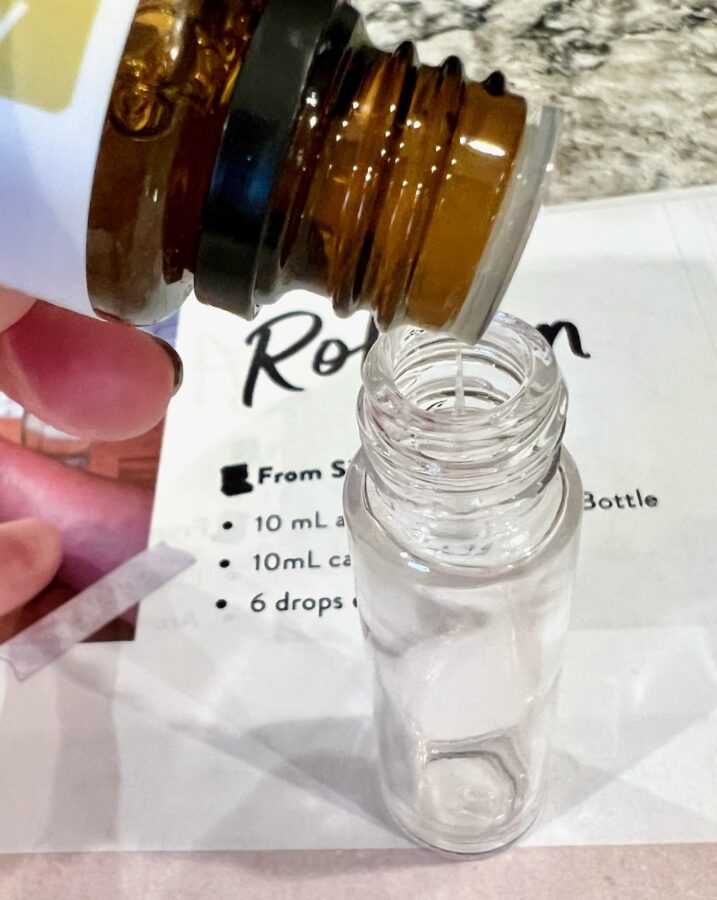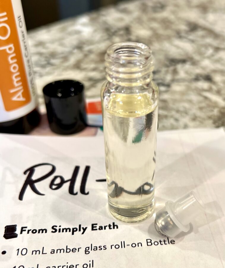 Materials required: 10 mL glass roll-on bottle, carrier oil, essential oil.