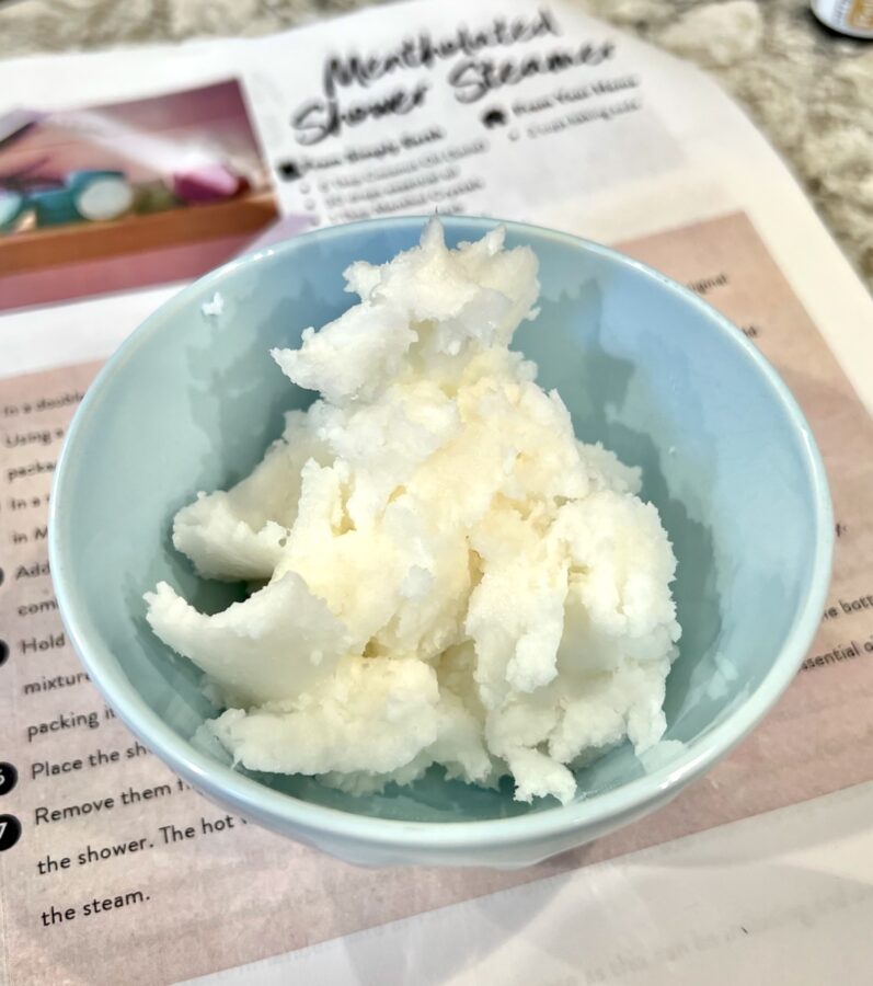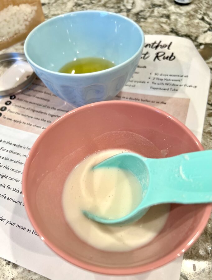 The first step was to melt together the shea butter, beeswax, and menthol crystals (shown in the blue bowl above). In a separate bowl, I mixed together the almond oil and Natrasorb until no clumps were left.