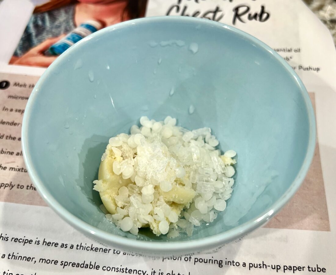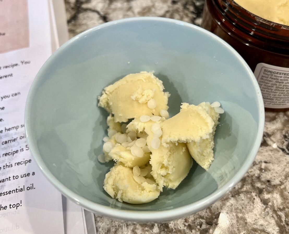 To begin, I needed to melt together the shea butter and beeswax. I did this by microwaving the bowl in 30-second increments until it was fully liquified.