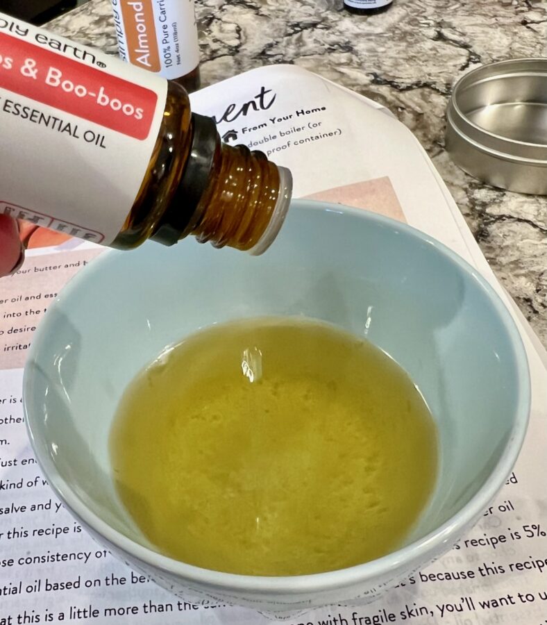 Next, I added the almond oil and my choice of essential oil — the Bumps & Boo-Boos blend.