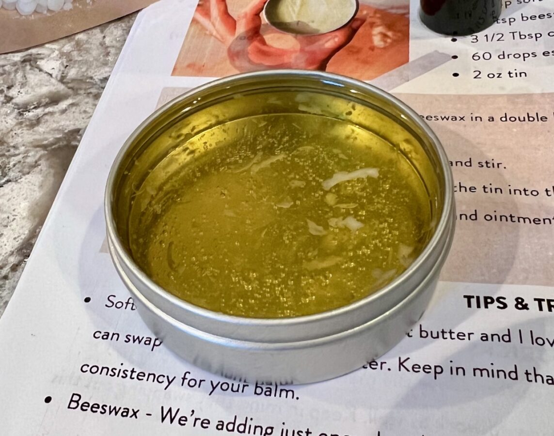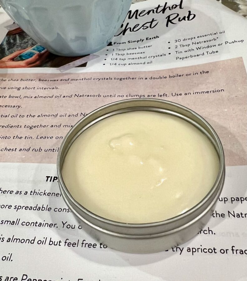 Materials required: Shea butter, beeswax, menthol crystals, almond oil, essential oil, Natrasorb, and tin or paperboard tube.