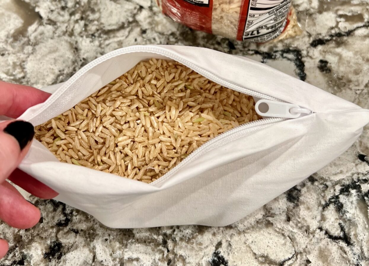 Using whatever rice you have on hand, fill the white pillow liner until it’s about 3/4 full and seal closed with the zipper.