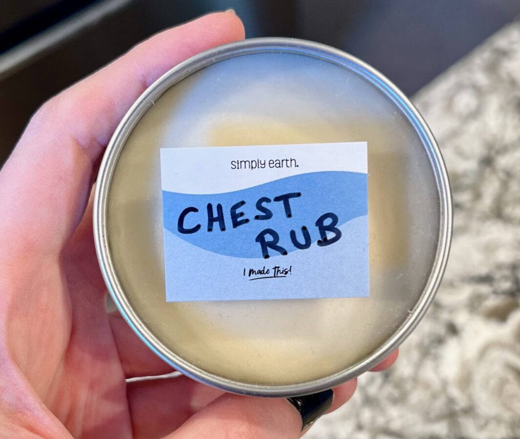 Once fully cooled/hardened, I replaced the lid and slapped on the customized label sticker. — I’ve made a similar chest rub with a recipe from a past Simply Earth box and it was great having a natural alternative to the store bought stuff (especially for my kids!).