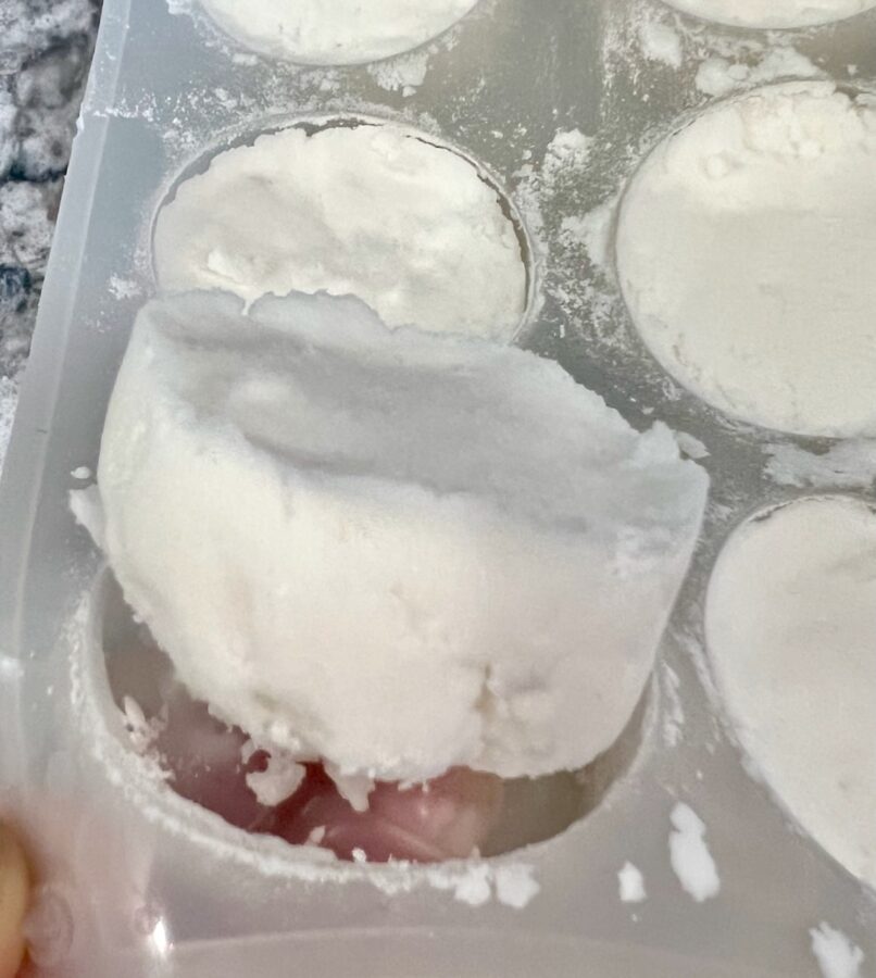 After allowing to harden, I popped each steamer out of the mold. They were a bit crumbly, but still held their shape enough to remove them all in one piece.