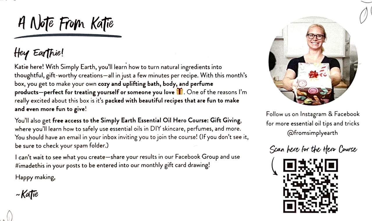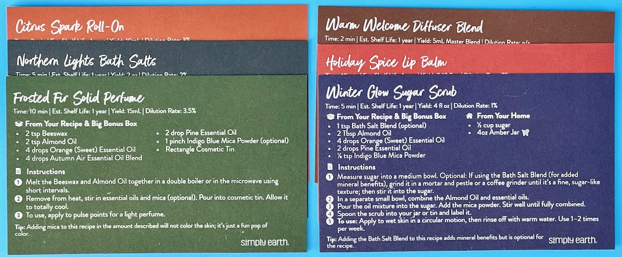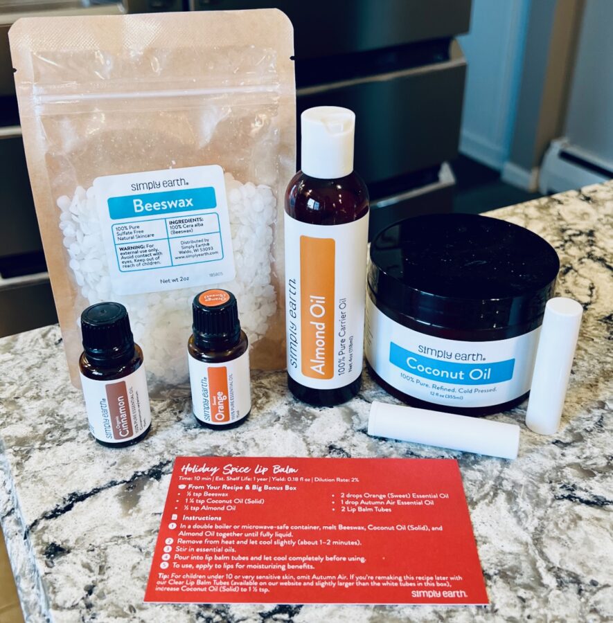 The November 2025 “Gift Giving” themed Simply Earth box included four seasonally-inspired essential oils and a collection of recipes to create my own naturally scented lip balms, solid perfume, bath salts, and more. As always, the recipes were incredibly easy to follow and took just minutes to complete. — Remember, for a limited time new subscribers can get a $45 gift card AND a FREE Bonus Box ($50 value!) with coupon code “WENDYROSEFREE“!